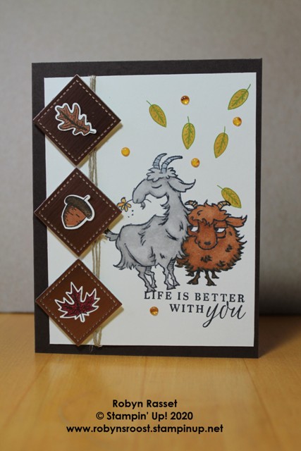 This card is very similar to the last card that I shared with you. The goats and greeting are the same, except that I have placed the tall goat in front of the short one. A friend of mine had create a card using the Brushed Metallic Paper with die cut squares and I loved the look and wanted to replicate it. So I added the leaves and acorns, stamped on Very Vanilla and punched out with the Autumn Trio Punch Pack. The Brushed Metallic squares are popped up with dimensionals and I wrapped Linen Thread around the Vanilla layer under them. I like the way the falling leaves turned out and I think the splash of green really adds to the card. The Cinnamon Cider Enamel dots make me think of the way the the sun sparkles on fall leaves.