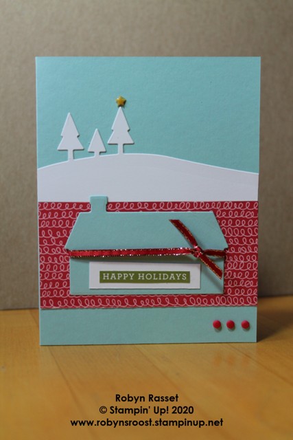 Are you looking for a simple to make Christmas card? Cut out all the elements and then put together assembly style for a stack of Christmas cards. I designed this card for my stampers who don’t like to color! Simply cut out the house using the Home Together Dies, from colored cardstock , add a piece of ribbon, and mount onto the Trimming the Town Designer Series paper. The swoosh with the trees is cut from one die. As a finishing touch add some of the Trimming the Town Elements.