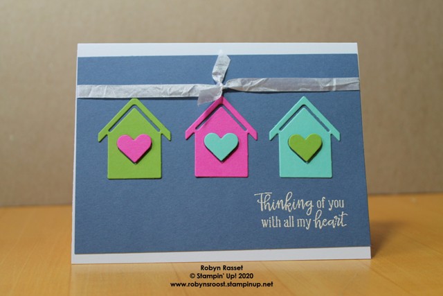 I CASE’D (Copy And Share Everything) this card from Susan Campbell, a talented Stampin’ Up! demonstrator from Minnesota. The little house die that these are cut from is in the Home Together Die set and doesn’t have a matching stamp, but it works great on its own. The greeting comes from the Peaceful Moments stamp set and is heat embossed with White Embossing Powder. The Misty Moonlight layer is cut to 5 1/2″ x 3 3/4″ and the white ribbon is added before adhering to the card base. The heart cut outs are swapped from one house to another and popped up with dimensionals.