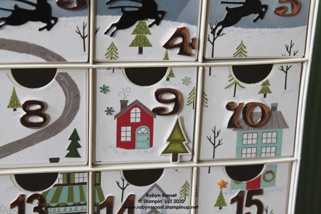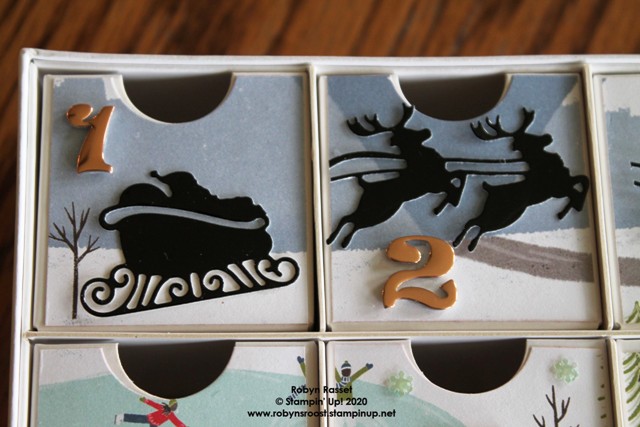 I used the Jolly Season Santa and reindeer die to put Santa flying across the top of the calendar. Some of the numbers were ones that I had from my scrapbooking stash. I have no idea how old they are or where they came from, but they were a shinny copper color and I liked them, so on they went. I used liquid glue to adhere everything.