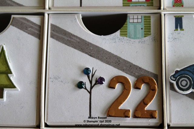 I used the Coming Home stamp set and the Home Together Dies to add some popped up trees. I also found the retired Santa’s Workshop Enamel Shapes with some tree stickers that I thought went well with the designs (lower right corner day 8).
