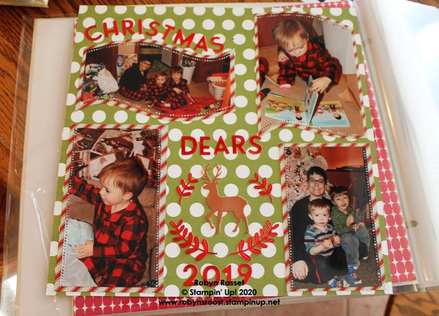 If you follow my blog, you know that I don’t often share photos of scrapbook pages. Cards are what I spend most of my creative time on, but I do occasionally do some scrapbooking. I tend to be very disorganized, (even more so than my card making) and I could even use bits and pieces from the trash, the junk drawer in the kitchen or the bottom of my paper stash that is 20 years deep. As I realized that Christmas is on the horizon again, I also realized that I haven’t finished scrapbooking last years’ Christmas photos yet, lol. So, I don’t have a card to share today, because I have been busy catching up on my scrapbooks. I do one for each of my 6 grandchildren, 5 different Christmas ones and I have one devoted to our time at the cabin. Here are a few of the pages that I’ve completed in the past week.