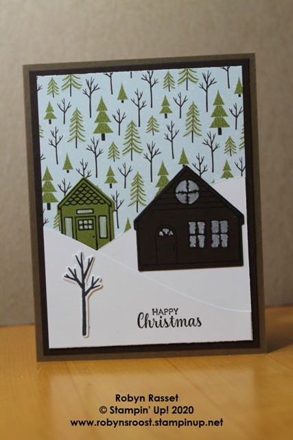 The tree design from the Trimming the Town DSP makes a great background for this cozy cabin scene and two pieces of whisper white paper cut with the snow pile swoosh die, created some cool piles of snow around the cabins. The little cabin in the background is tucked behind the snow piles. The bare branched tree is stamped and die cut and then adhered to the card. If you needed to add bling, 3 rhinestone jewels would go nicely to the right of the greeting, but I wanted to leave this card plain.