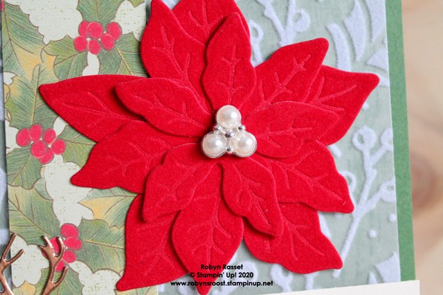 I used the Beaded Pearls for the center of the Poinsettia on this card, but if I were going to make a bunch of these to mail for Christmas, I would make paper centers using the dies in the Poinsettia Die set.