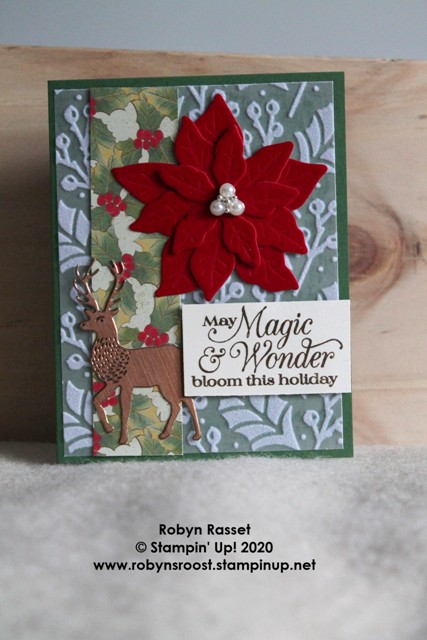 Time for another sketch challenge with the STARS demonstrator group. Today, I wanted to try out the embossing dies from the Poinsettia Die set with the Red Velvet paper. I’ve stamped on the Red Velvet Paper with good results and was pretty sure that the paper would look beautiful embossed as well. I can happily report that it does indeed look beautiful embossed!
