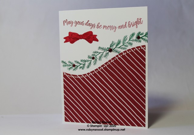 I’ve created 2 quick and easy cards using both pieces of paper from one die cut. For the top card I used the portion of the die cut piece that had the hole in it. Then stamped some of the pine boughs in Shaded Spruce. The bow and words are stamped with Cherry Cobbler and the bow is colored with a Real Red Stampin’ Write Marker.