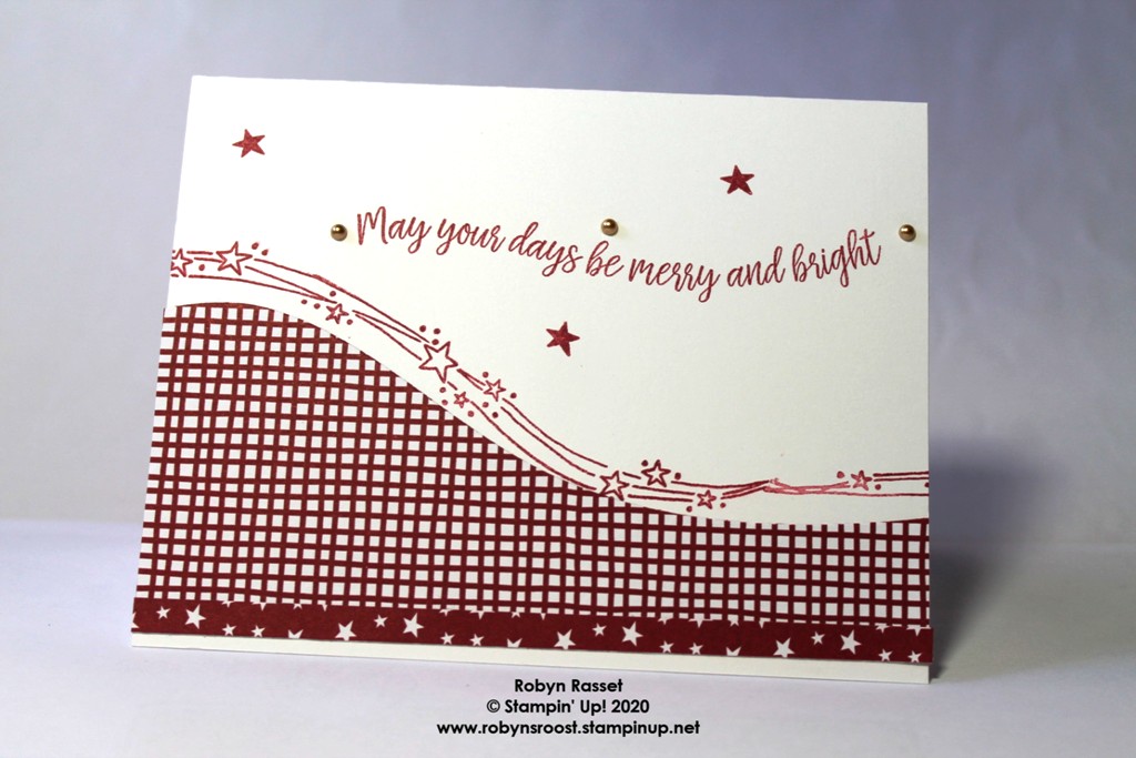 The second card is all done in Cherry Cobbler. I did have to stamp the stars twice to get the curves to match up to the paper. I also added a small strip of a different design of the Classic Christmas paper to the bottom of the card.