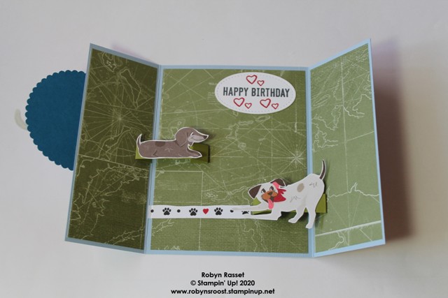 The little supports for the pups are pieces of old olive cardstock cut to 1/2″ x 3″ and scored at 1/2″ on one end and 1/2″ and 1″ on the other end. I used Tear n Tape to adhere them to the card.