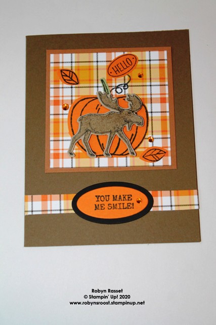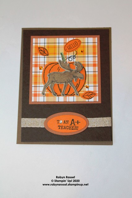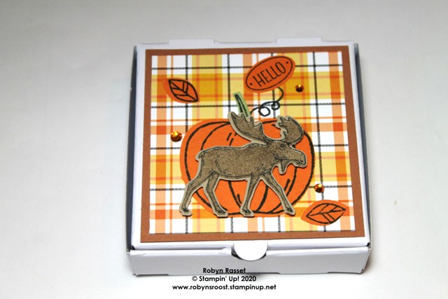 The Apple Builder Punch (which can also be a pumpkin) done in Pumpkin Pie cardstock, made a nice backdrop for my Merry Moose Punch. The pumpkin stem is also punched with the Apple Builder Punch from Pear Pizzazz paper and the leaves are from Pumpkin Pie. I wanted to have a greeting that simply said “hello” for this treat box and neither the Harvest Hello or the Merry Moose set had one, so I pulled out the Country Home stamp set for the little hello and the tiny oval tag.