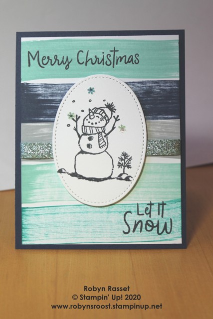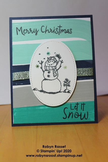 Isn’t this little guy cute? The background is created by dragging those little ink spot (ink pads) across the paper to create colored stripes. The amount of ink in the pad and the pressure while dragging will vary the depth of color. Light pressure and a drier ink pad will create the look on the above card, while a wet ink pad and heavy pressure will create the look on the card below.