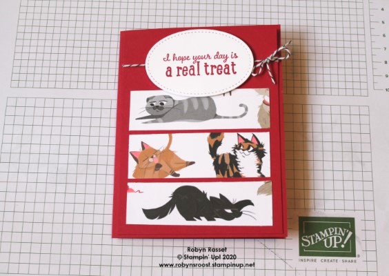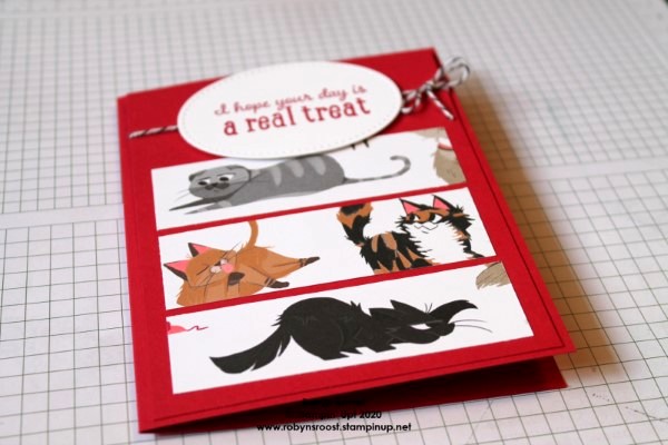 This card was quick and easy to make. The 3 strips of the Pampered Pets Designer Series Paper make a great focal point all on their own. The strips are about 1″ x 3 1/2″. They aren’t exact so that I could get the kitties fit in the best way. To have a good way to tie the ribbon onto the card, I’ve added a 4″ x 5 1/4″ panel in matching Real Red cardstock to layer onto the cardbase.