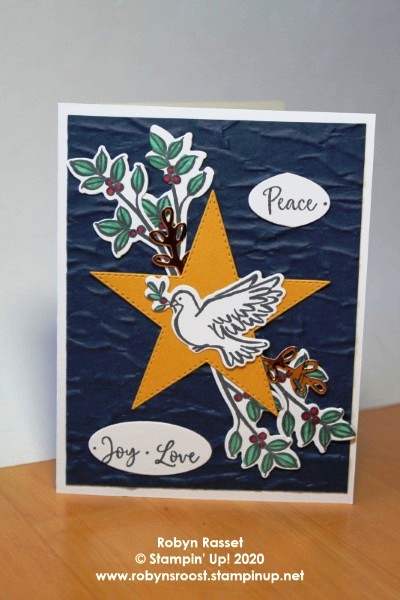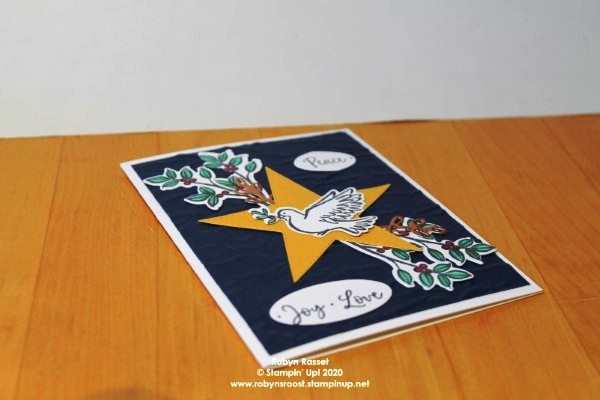 I decided to use a Stitched Star shape instead of the hexagon on that is on the inspiration layout. It just seemed to fit behind the Dove of Hope. The star is cut from Bumblebee cardstock, which is one of the 2020-2022 In-Colors. It has a nice golden hue, so works great for Christmas cards. The Night of Navy layer is 4″ x 5 1/4″ and is embossed with the Old World Paper Embossing Folder. The leafy branches are colored with Shaded Spruce and Cherry Cobbler Stampin’ Blends and I added a couple of little foil leaf die cuts too. I couldn’t fit the Peace, Joy, Love greeting onto the card so I decided to split it into two parts. I used the Layering Ovals Dies to cut out the greeting. I stamped it twice so that I had room to cut them both. For the Peace greeting, I cut it once and then layered the oval across the end to shorten it, and cut it again. It created a lopsided oval, but I actually liked the look, so I went with it. It made me think of a glass Christmas tree ornament