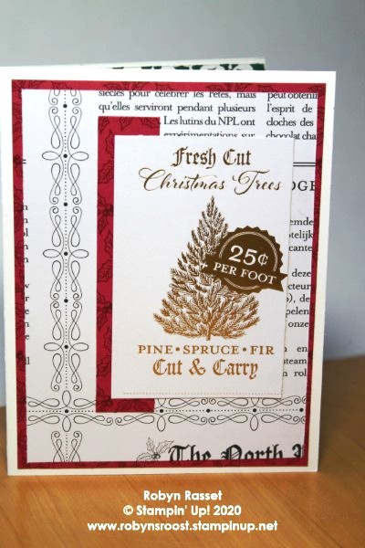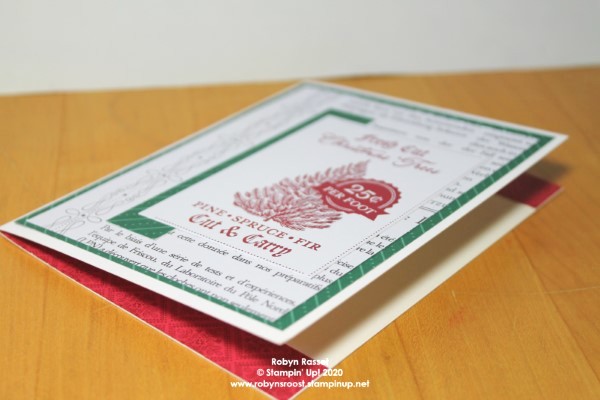 Next, is a 4″ x 5 1/4″ layer of green striped ‘Tis the Season Designer Series Paper. On top of that is a piece of the black and white side of the Wonder of the Season Specialty Designer Series Paper that is cut to 3 3/4″ x 5″. I chose the piece because of the pretty design on the left edge. The little 3/4″ x 4″ piece of the ‘Tis the Season DSP is the scrap off of the bottom piece. Then the tree ad is about 2 1/2″ x 3 1/2″.