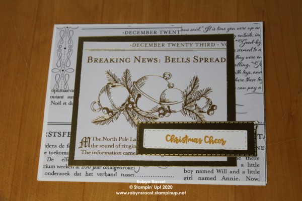 The gold foil version of the collage card with bells has a much simpler greeting. The greeting is stamped with Bumblebee Ink onto a piece of whisper white and cut with one of the Stitched Rectangle Dies then layered onto a piece of gold foil that is also die cut with a Stitched Rectangle Die.