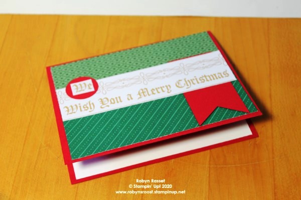 The Santa’s Hot Chocolate graphic was only in red foil and I wanted to do another gold foil card so I found this We Wish You a Merry Christmas headline and thought that this would make another pretty card. It came together pretty quickly. It starts with a Real Red cardbase and some 2″ x 5 1/4″ strips of ‘Tis the Season DSP. Watch it come together on the Wonder of the Season – Part 5 Video Tutorial.