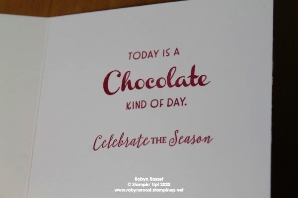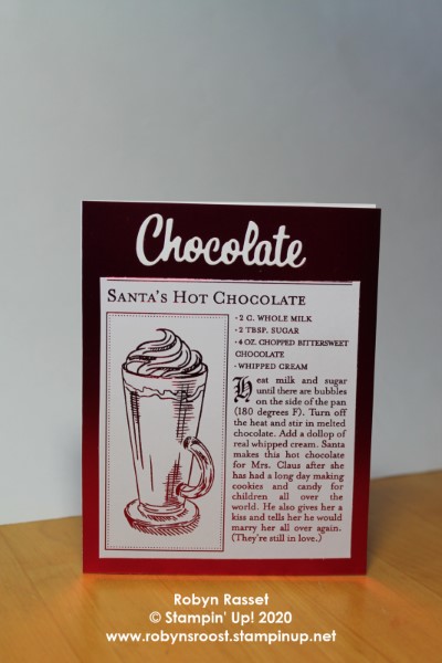 Okay, when I saw this recipe for Santa’s Hot Chocolate I wanted to try it! Besides the graphic is so, so pretty! I decided to bull out the Love You More Than Dies and Nothings Better Than stamp set to double up on the Love of Chocolate. The die cut word is super easy to create with the Love You More Than Dies.