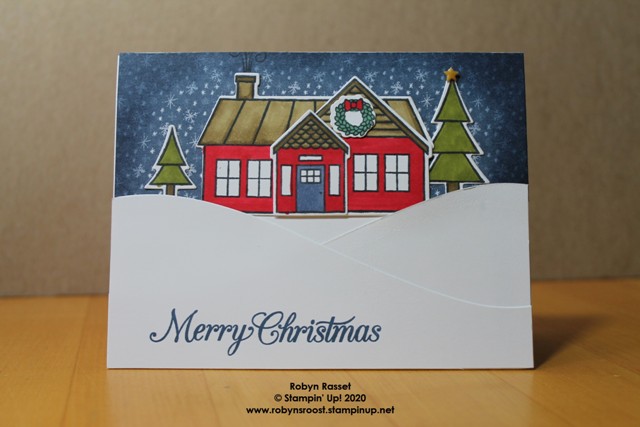 - Stamp the Itty Bitty Christmas greeting with Misty Moonlight ink.