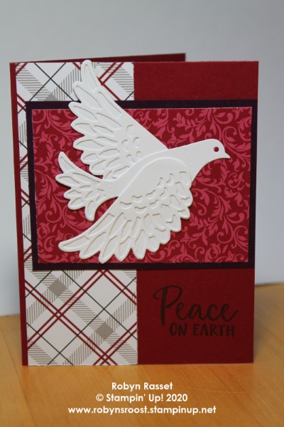 This pretty dove cut with the Stampin’ Up! Detailed Dove Dies is perfect if you are looking for a Christmas card with a Peace theme. The matching Dove of Hope stamp set has both greetings and dove images to coordinate with the dies. The patterned papers used on this card are all out of my retired paper pile but Classic Christmas or Heartwarming Hugs DSP would be good picks as well. Here are the measurements: