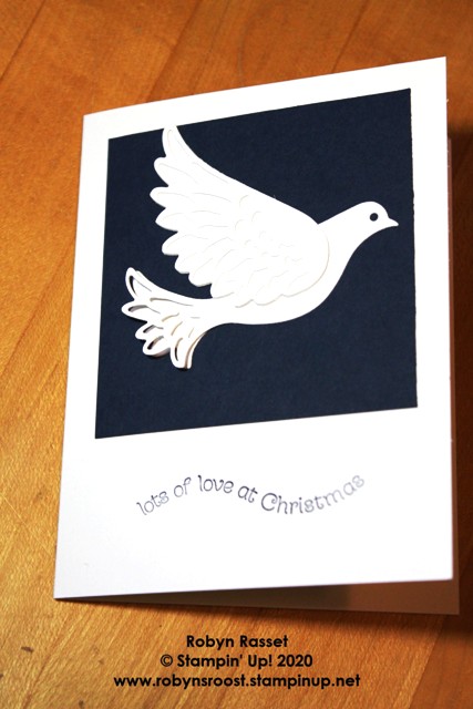 For the dove on this card, I only used 1 set of the wing dies and only partially adhered the detailed tail over the solid tail piece. I thought that the tail would have some visual movement this way. It seemed to fit well with the curvy lots of love greeting from the Itty Bitty Christmas stamp set. This card is easy to make and goes together quickly, making it a good choice for multiple cards.