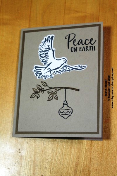 The dove is stamped on a scrap of white cardstock with Tuxedo Black ink using the Doves of Hope stamp set and cut with the matching die from the Detailed Doves Dies. The greeting, bough and ornament are all from the Dove of Hope stamp set and are also inked with Tuxedo Black ink. I like the way that the white dove really pops on the Crumb Cake background.