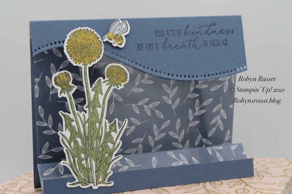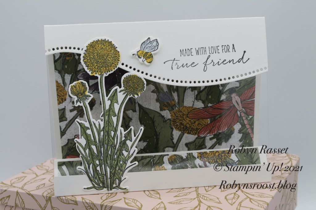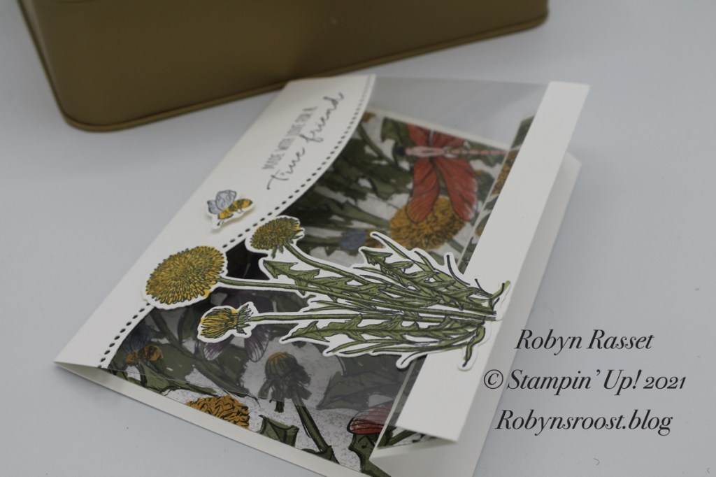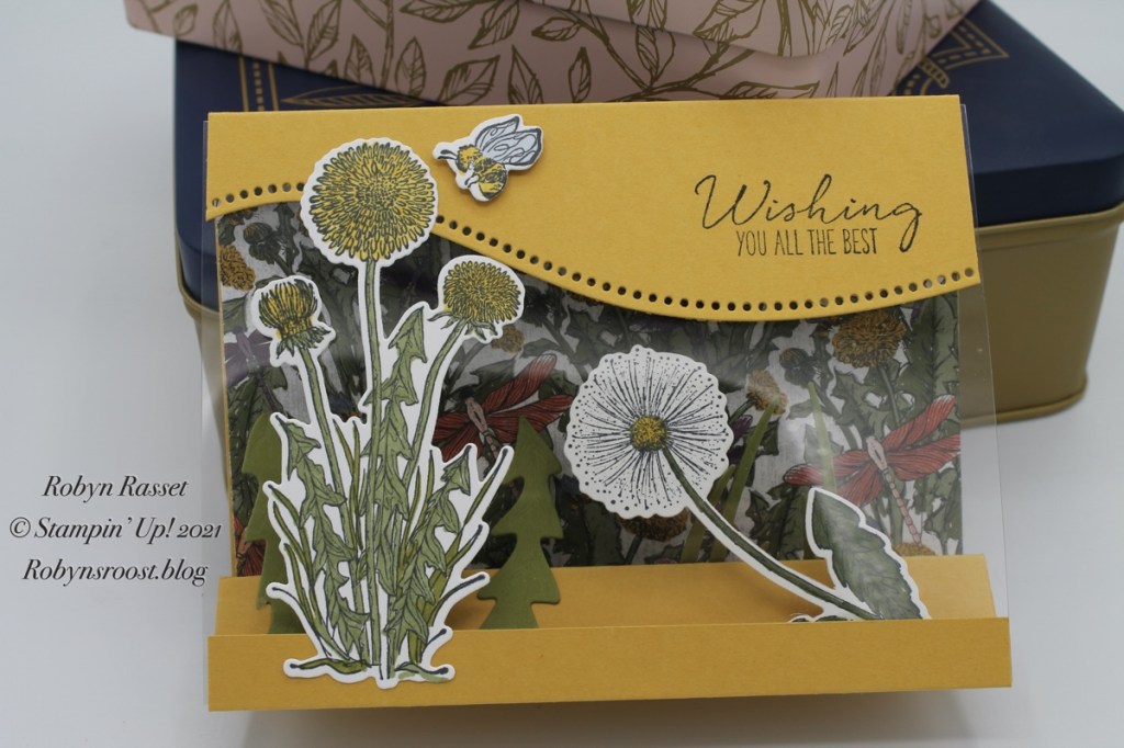 For this card, I added some leaves and another dandelion to the inside folds on the card. The card base is Bumblebee and the greeting is also from the Garden Wishes set.