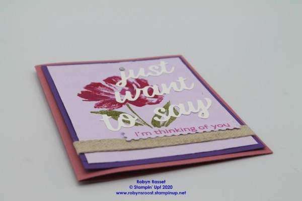 The fun postage stamp edged die cut is from the matching Floral Gallery die set. There are 2 different sizes to fit the 9 different greeting that are included in the Art Gallery stamp set.