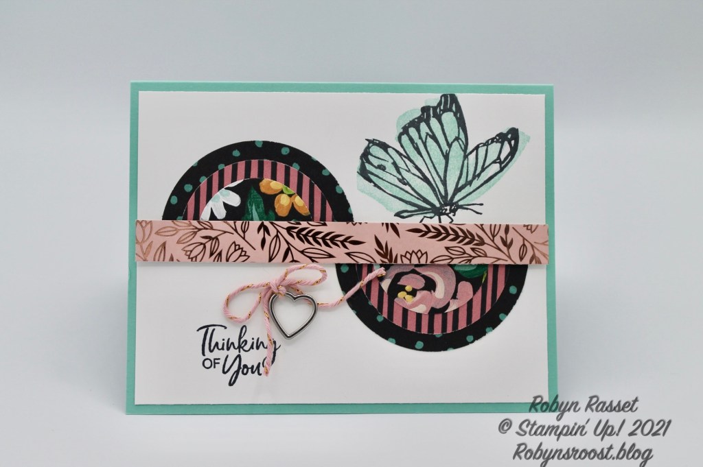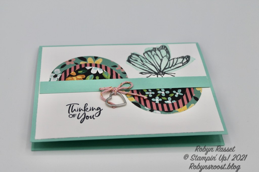 This card is the same, except that I have used the opposite side of one of the papers (Flower & Field), which by the way you can get for Free during Sale-a-bration (January 5 thru February). And I have added a strip of the gorgeous Love You Always Specialty Paper from the New January to June Mini Catalog. The cute Heart Charm is also part of this Love You Always Suite. The stamp set used on this card is also a Free Sale-a-bration item called A Touch of Ink. I’m a sucker for butterfly stamps and this one includes a hummingbird too!