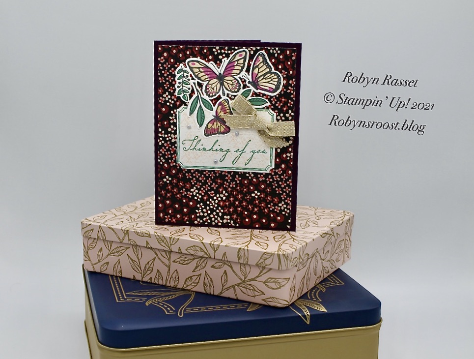 The floral paper is from the Flower and Field Sale-a-bration paper pack and is cut to 4″ x 5 1/4″. If you purchase the Floating and Fluttering Bundle Plus the Just Jade ink pad you can choose to get the Flower and Field paper for FREE. Just sayin’. The ribbon is the Fine Art Ribbon which is shot thru with gold thread, so that it has a very subtle shimmer.