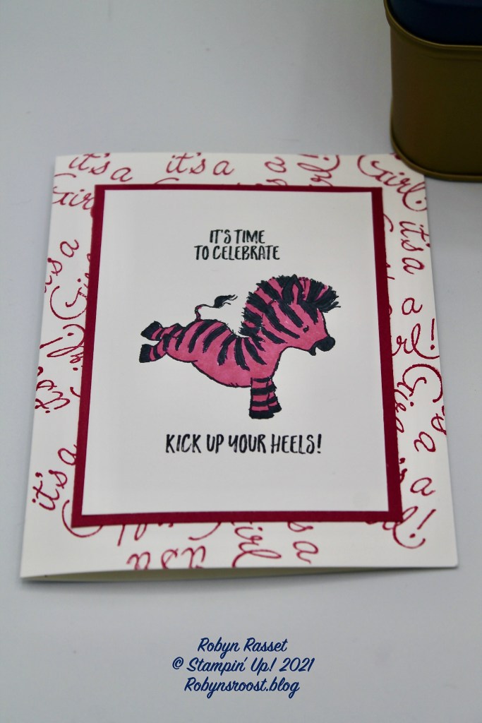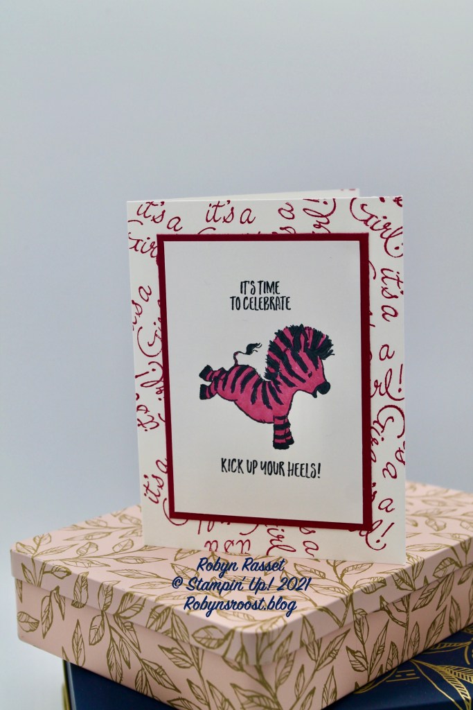 I chose to use the Zany Zebras stamp set and stamped the images, using Tuxedo Black ink on a piece of white card stock that is cut 3″ x 4 1/4″. I colored the Zebra with Stampin’ Blends in Dark Melon Mambo and Light Black. Then added a 3 1/4″ x 4 1/2″ layer of Melon Mambo behind it.