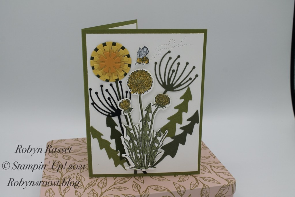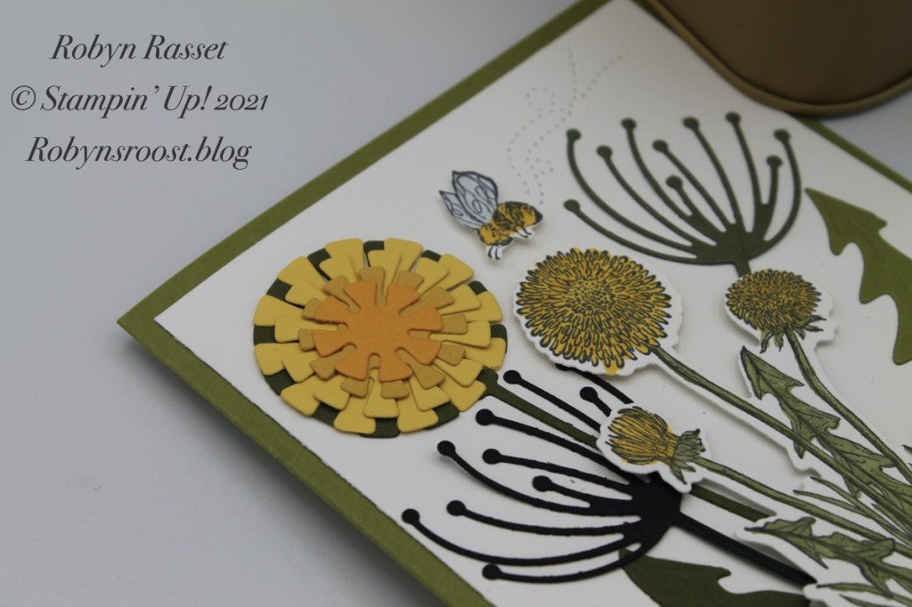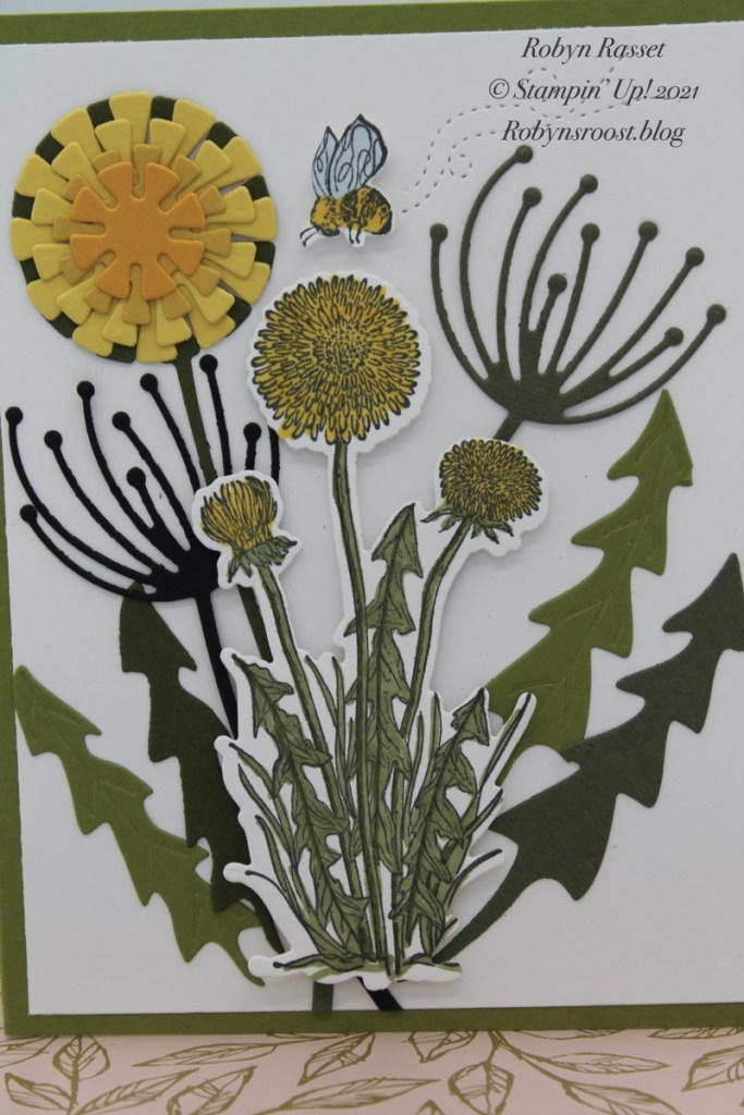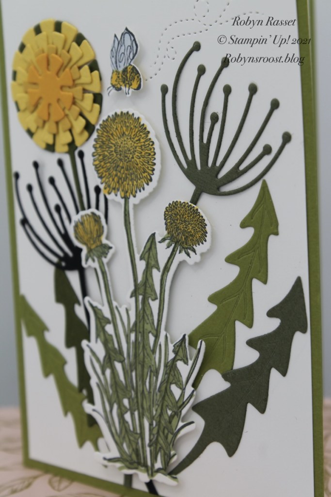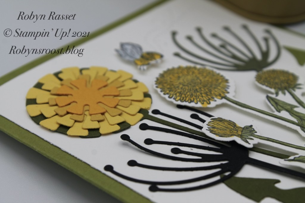 The dandelions in the center die cut are colored with Daffodil Delight Stampin’ Blends and the leaves are colored with both Light and Dark Mossy Meadow. The dandelion leaves that are die cut from colored papers are cut from a mix of Old Olive and Mossy Meadow card stock.