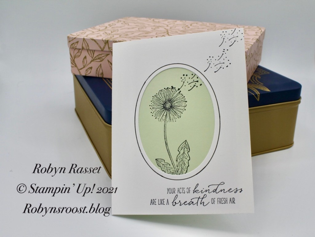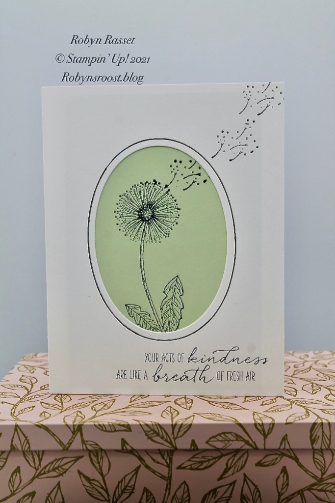 I started this card by die cutting the oval out of the front of a Thick White card base. I stamped the dandelion on a piece of Mint Macaron cut to 4 ” x 5 1/4″. If you are worried about getting the image in the exact center of the oval, place the mint paper behind the oval and mark the edges with a pencil, then remove it and stamp the image. I just ball parked it, so the dandelion isn’t in the exact center.. After stamping the greeting on the bottom, I felt that the card needed a bit more. I free handed the black line around the oval with the pen end of a Black Stampin’ Write Marker. It still need something and my adult son walked into my crafting roost (room) and he noticed the little seed stamp and mentioned having the seeds blowing off the card. I thought it really fit with the greeting.