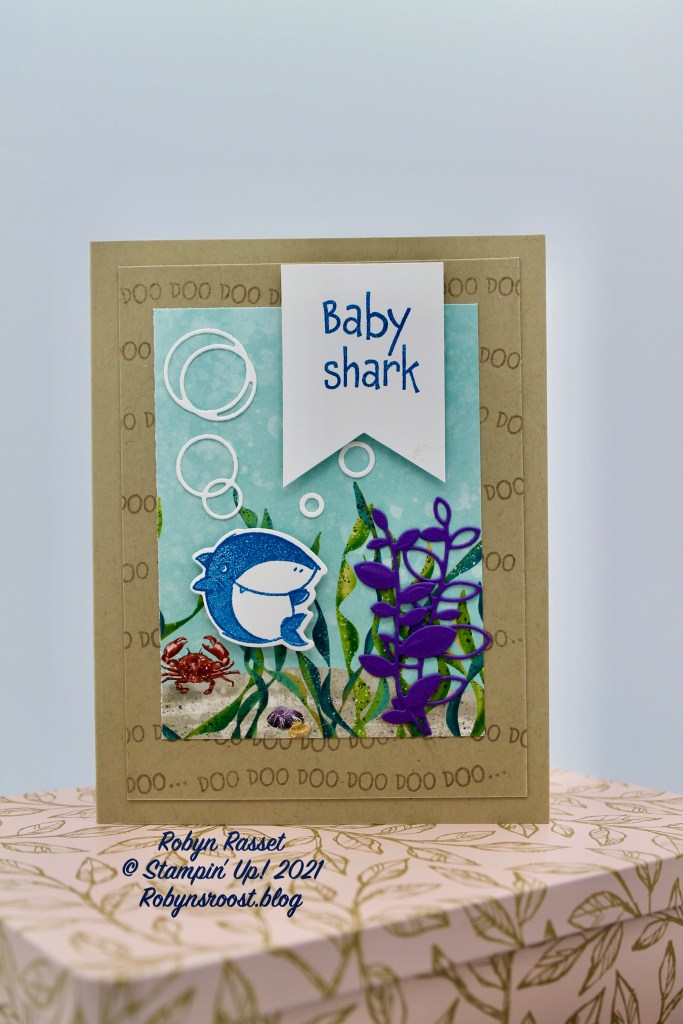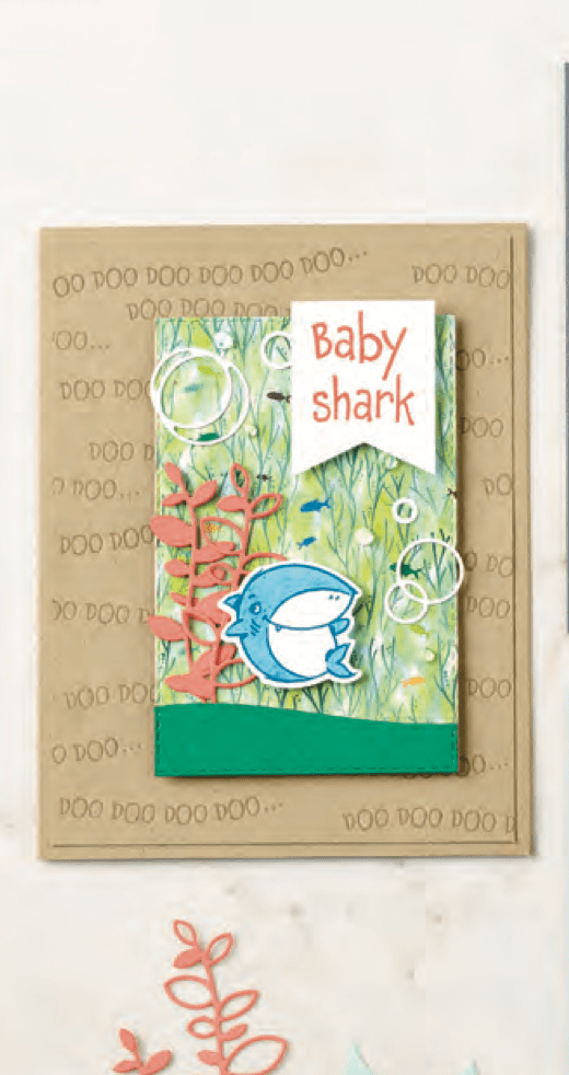 If you purchase the Shark Frenzy stamp set or Bundle (You NEED the Bundle!) be sure to throw a pack of the Whale Of A Time Designer Series Paper onto the order as well. The Whale Of A Time DSP coordinates so well with the Shark Frenzy stamp set and makes such great backgrounds for the shark family. The Whale of a Time DSP is so much fun to work with because it coordinates with so many fun, bright colors. I haven’t yet put the Whale together with the Sharks but hmmm…. I think I need to try that!