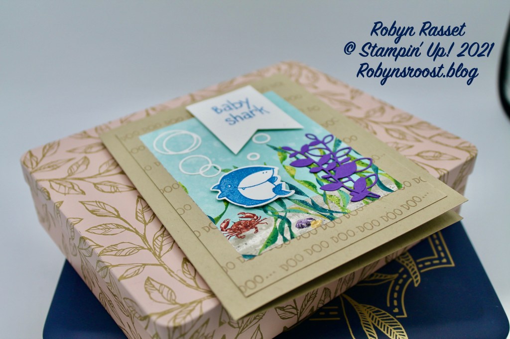The catalog version uses a Stitched Rectangle Die to cut out the designer paper layer and also adds a strip of card stock across the bottom. I swapped out the Coastal Cabana shark for a Pacific Point color instead and made some Gorgeous Grape seaweed instead of the Calypso Coral ones. CASEing (Copy And Share Everything) a card from the catalog is a great way to get started.
