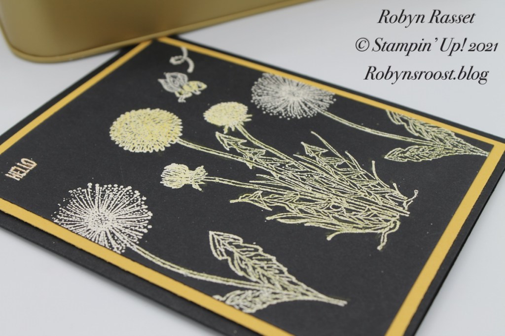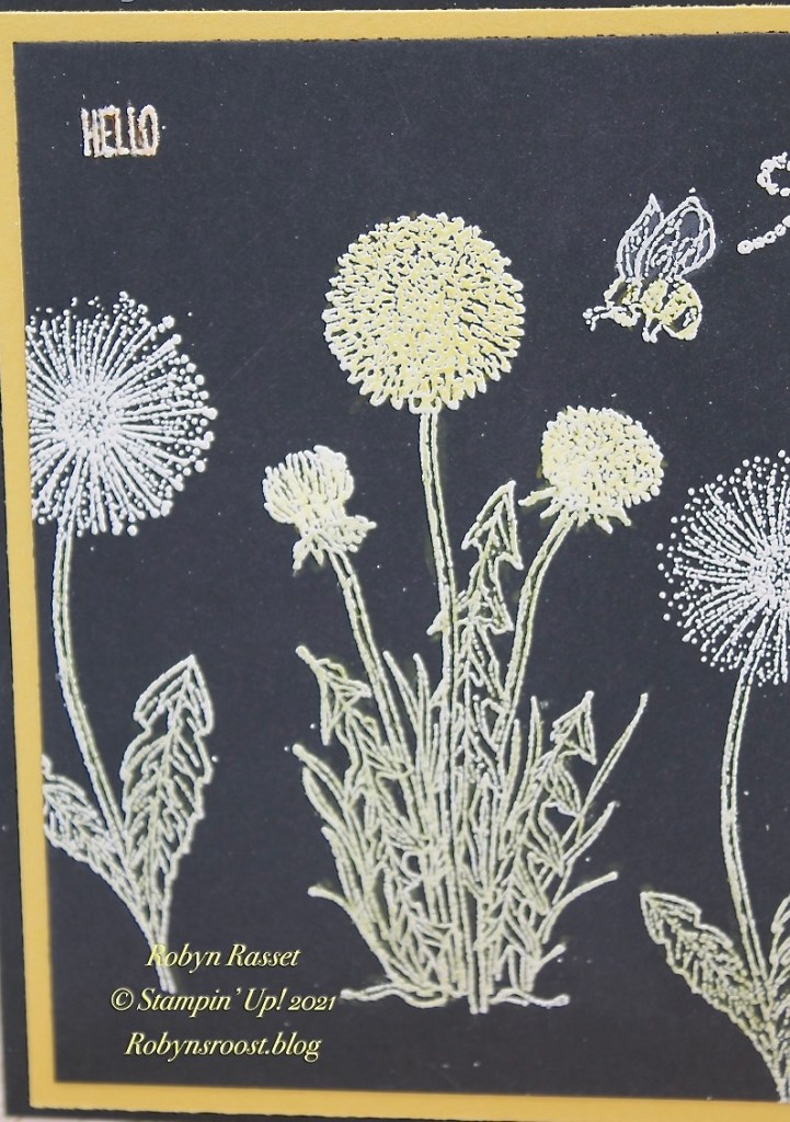 After heat embossing use Stampin’ Up!’s Watercolor Pencils to color the white embossing powder lines. Color all of the leaves with Old Olive. Leave the seeded out dandelions white, but color the others with Daffodil Delight.