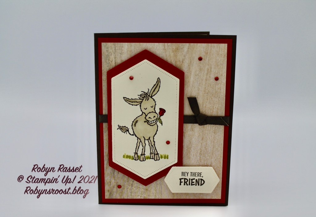 I love the way that Betty hase given this cute card a barnyard feel with the wood grained designer paper and colors that she chose. The Donkey is colored with Stampin’ Blends and she has used the Stitched Nested Labels dies to cut out the Darling Donkey and the greeting pieces. Even the ribbon echoes the barnyard feel and the red rhinestones pull out the color of the rose in the Donkey’s mouth.