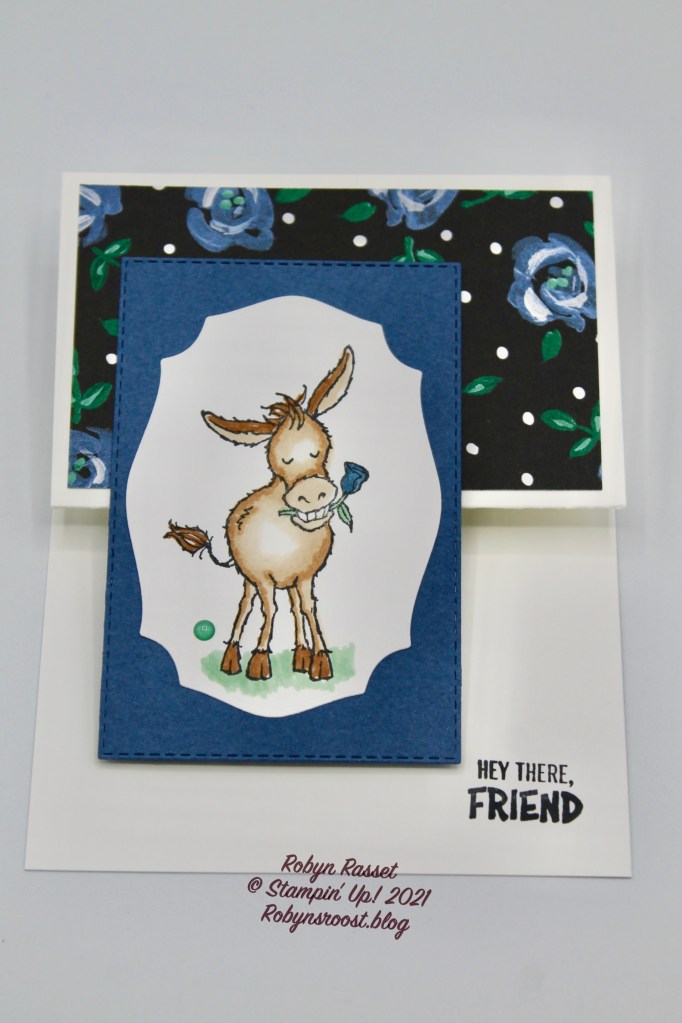 This Darling Donkey not only shows off a unique Fun Fold Technique but also uses a piece of the Field and Flowers Designer Series Paper which is another item that can be earned for free with a $50 order. If you want to recreate this card here are the dimensions: