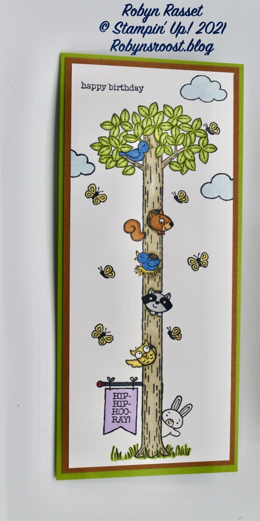 There are 3 stamps that create the whole tree. They are fairly easy to line up. If you look closely you might be able to see where they are lined up. Most of the animals are included in the tree trunk stamp. The bunny is stamped separately as well as the flag and flag pole. I may have gotten a little carried away with the butterflies but they were so much fun to stamp, I added a whole bunch. A couple of clouds and a birthday greeting completed the stamping.