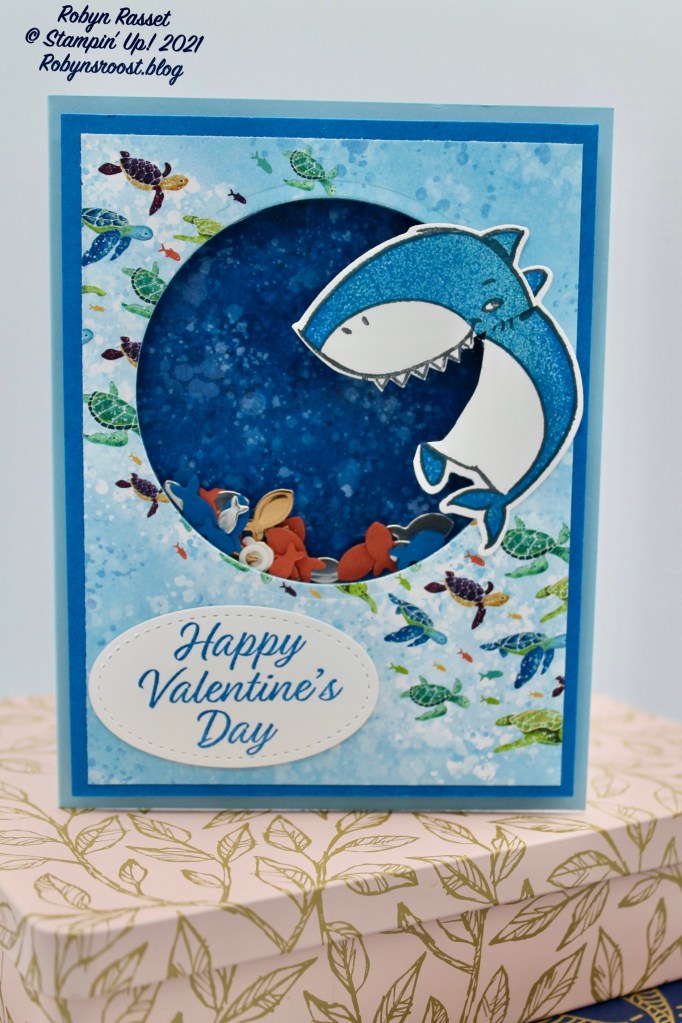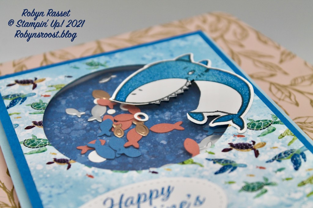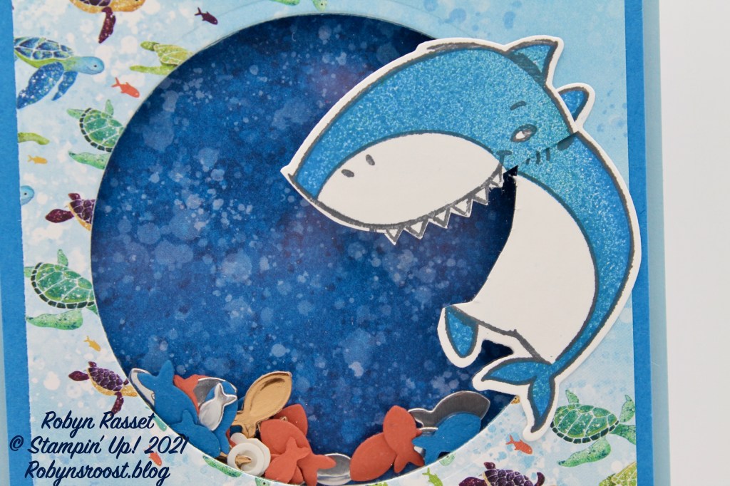 I love a card that generates a smile or laugh and this card definitely does that with this chomping shark and the little fish behind him in the shaker card.