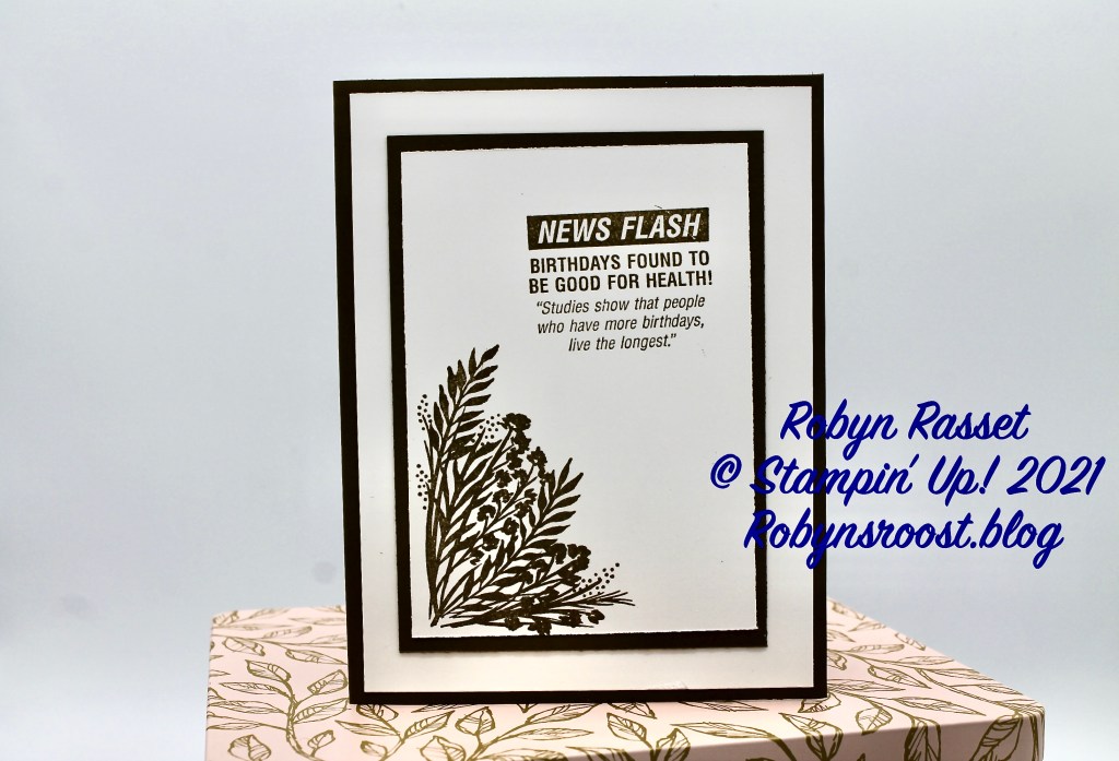The free Sale-a-bration Corner Bouquet set is great for making a simple card. I’ve stamped the image with Early Espresso ink, added a birthday greeting from the Free, Approaching Perfection stamp set also stamped with the Early Espresso ink.