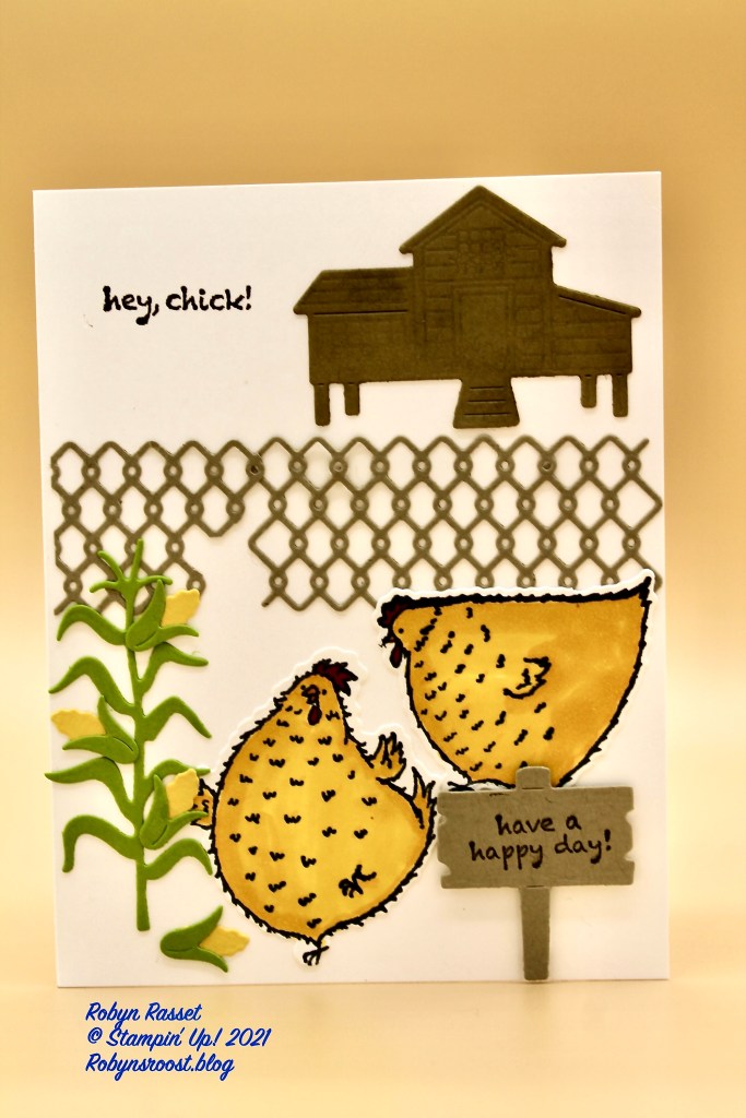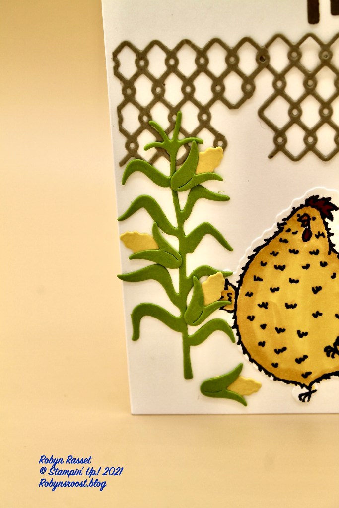 I cut the coop die from Soft Suede card stock. The detail is amazing on this die, but it didn’t pop out the way that I wanted it to so I used a Blending Brush and some Soft Suede ink and rubbed the ink over the coop to bring out the details. The Chick Dies are worth buying just for this coop and corn stalk! They are awesome! If you look closely at the chicken wire below the coop, you can see where the two pieces overlap just below the period in RobynsRoost.blog.
