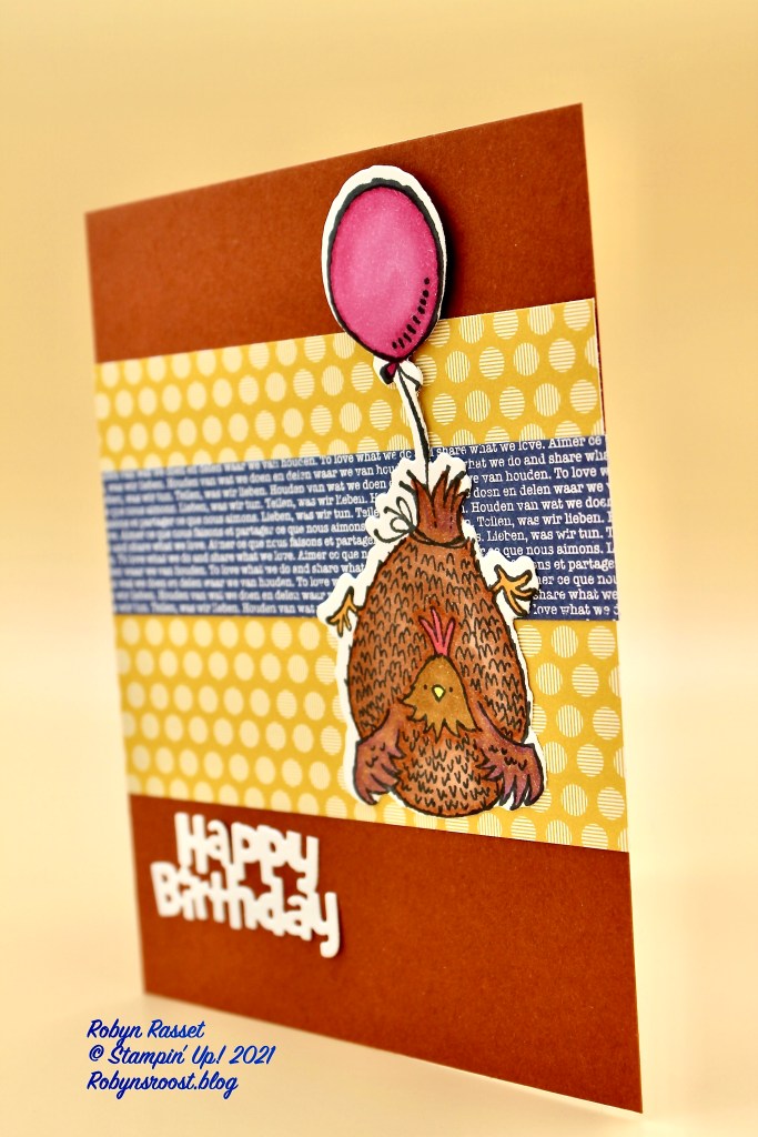 The card base is Cajun Craze and I’ve used the In Color Designer Series paper for the 2 layers. The Bumblebee layer is 4 1/4″ x 3″ (so I could get 2 pieces) and the Misty Moonlight layer is 1″ x 4 1/4″. I love the Happy Birthday die from the Birthday Chick Dies! It’s perfect! I know I will be using this die lots. I cut this one out of white paper. The balloon is popped up with a dimensional but the rest of the chicken is adhered flat to the card.