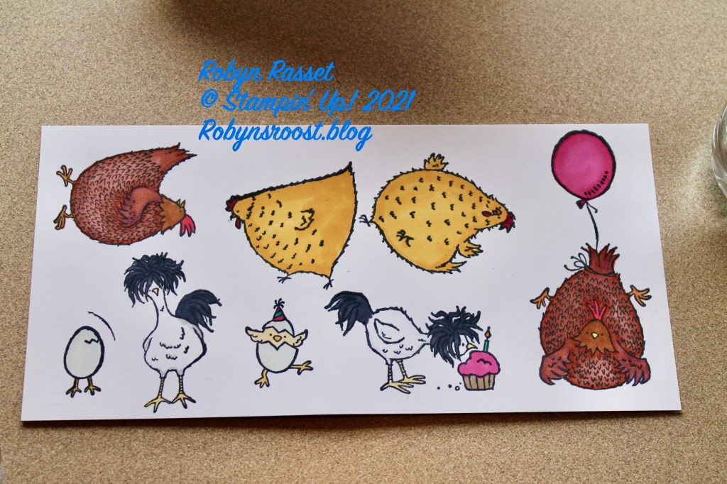 The chicks are colored with Cajun Craze Stampin’ Blends in both light and dark and the wings are outlined with Highland Heather. The feet are done with Pumpkin Pie and the beak is Daffodil Delight. The comb is Light Real Red.