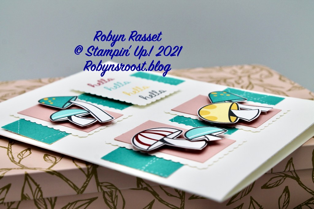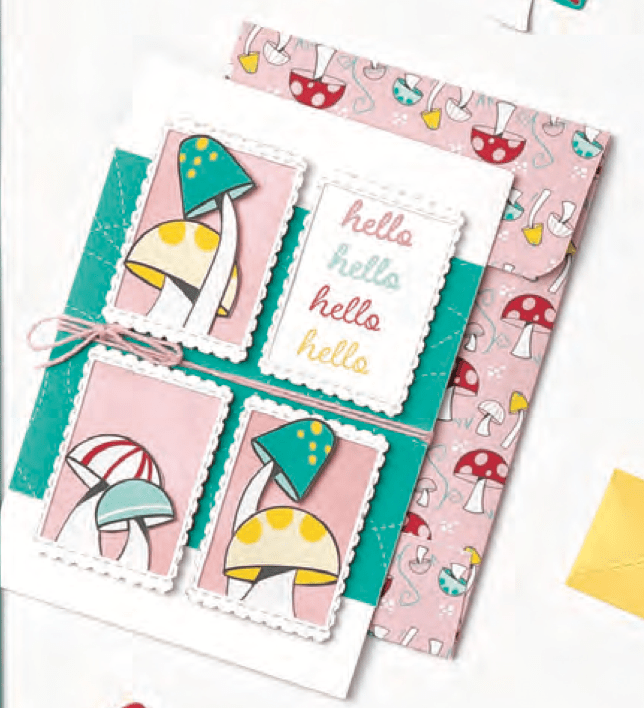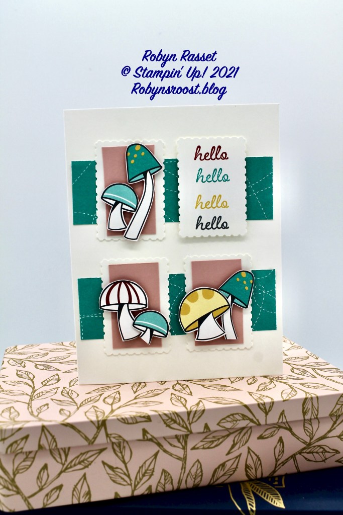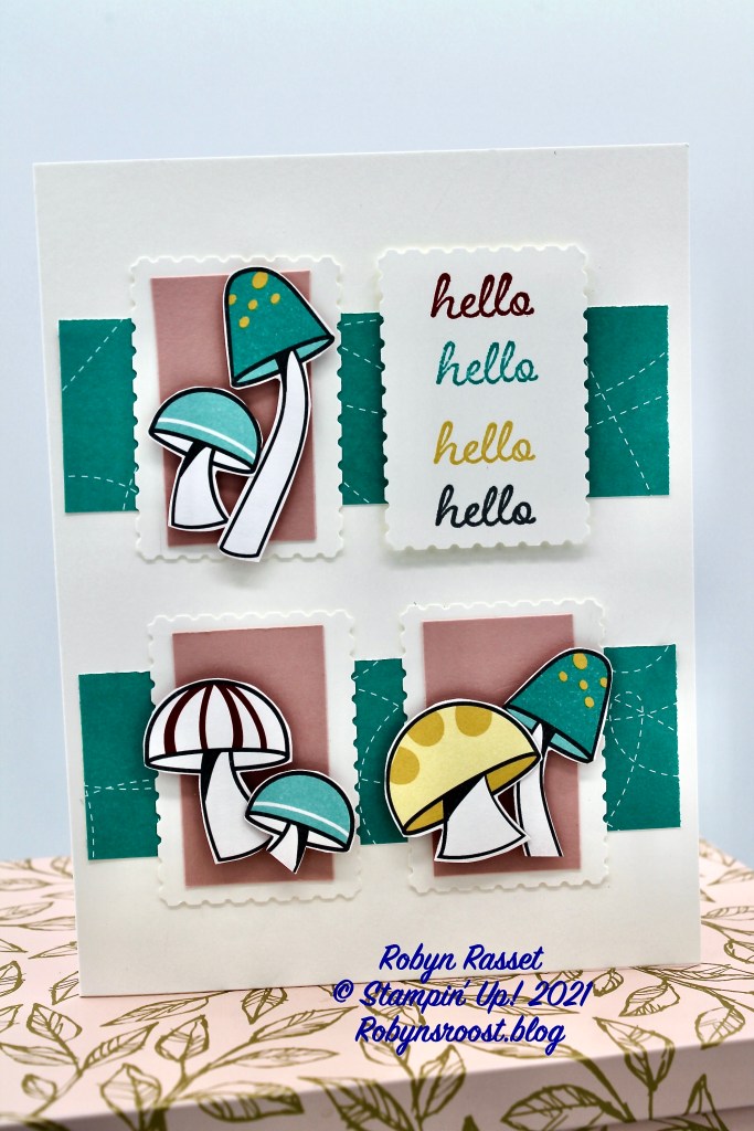 The mushrooms are all fussy cut from the Snail Mail Designer Series Paper. I opted to do 2 narrow strips of the Snail Mail DSP under the Postage Stamps instead of one large one. I liked more white space, but it also made it harder to add the ribbon, so I left that off.