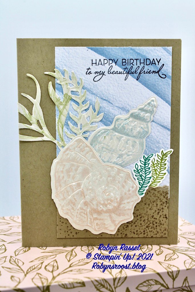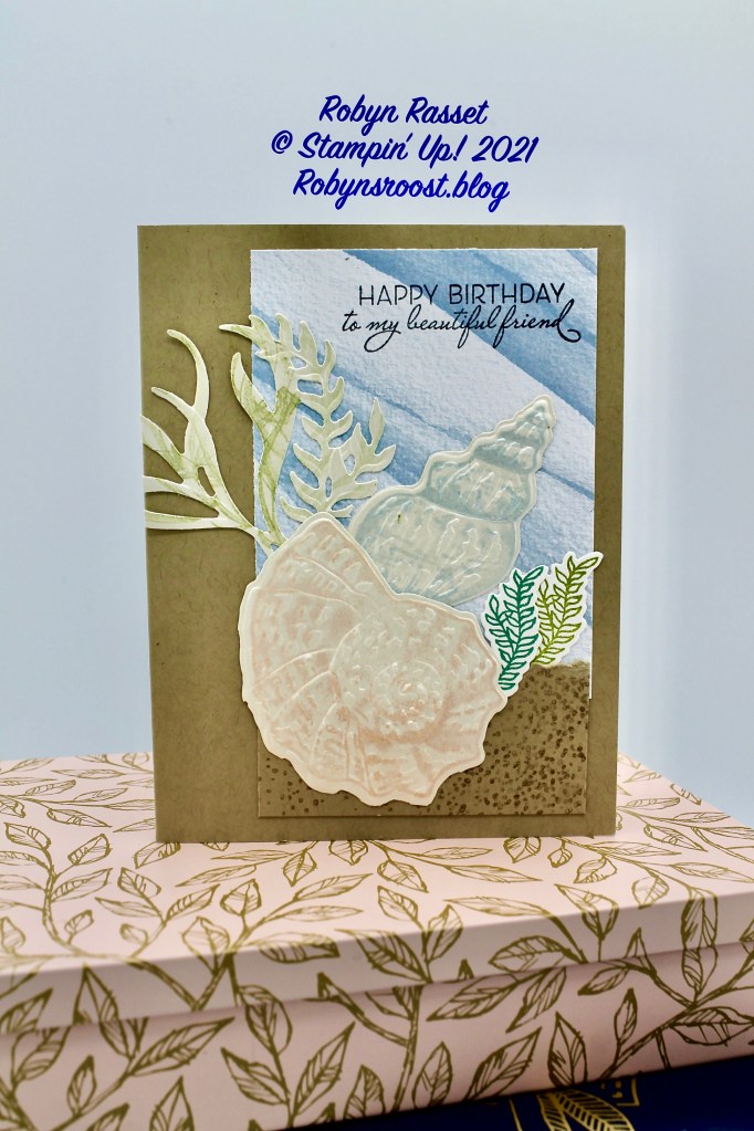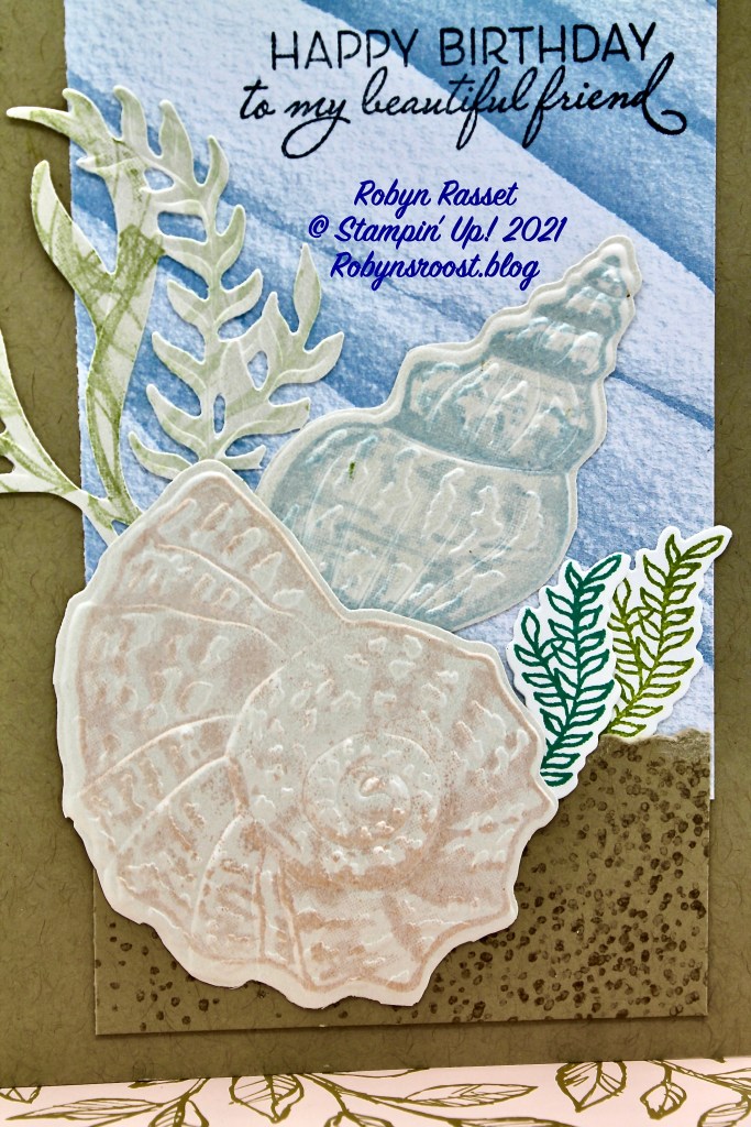 I’ve spent a couple of days at the beach while we’ve been on vacation in Florida and although I found a few shells none were as pretty as these. These were stamped on Pearlescent Speciality Paper with Seaside Spray and Petal Pink ink. Die cut with the Seaside Seashell Dies, embossed with the Seashells 3D Embossing folder and then cut apart into separate pieces. The 2 little pieces of seaweed on the right side are stamped on white card stock and die cut. You can see the difference between the white card stock and Pearlescent Speciality Paper.