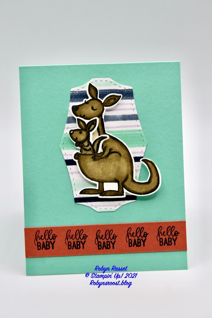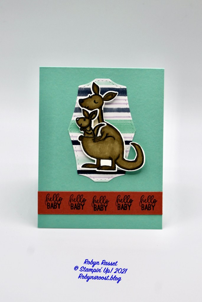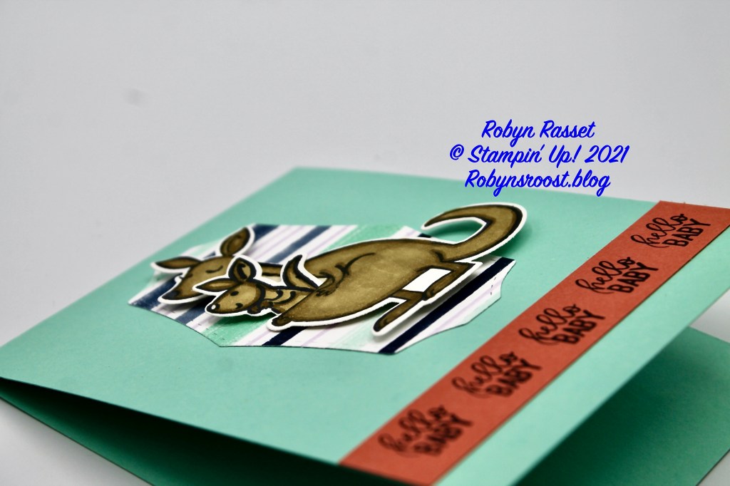 The greeting strip is a 3/4″ x 4 1/4″ piece of Calypso Coral and the hello baby greeting is stamped with Tuxedo Black ink. The Playing with Patterns Designer Series Paper behind the Kangaroos was cut using the Wild Rose Dies. I really like the Playing with Patterns DSP for fun backgrounds. It’s a 6″ x 6″ stack and has such bright colors and a mix of patterns with dots and stripes.