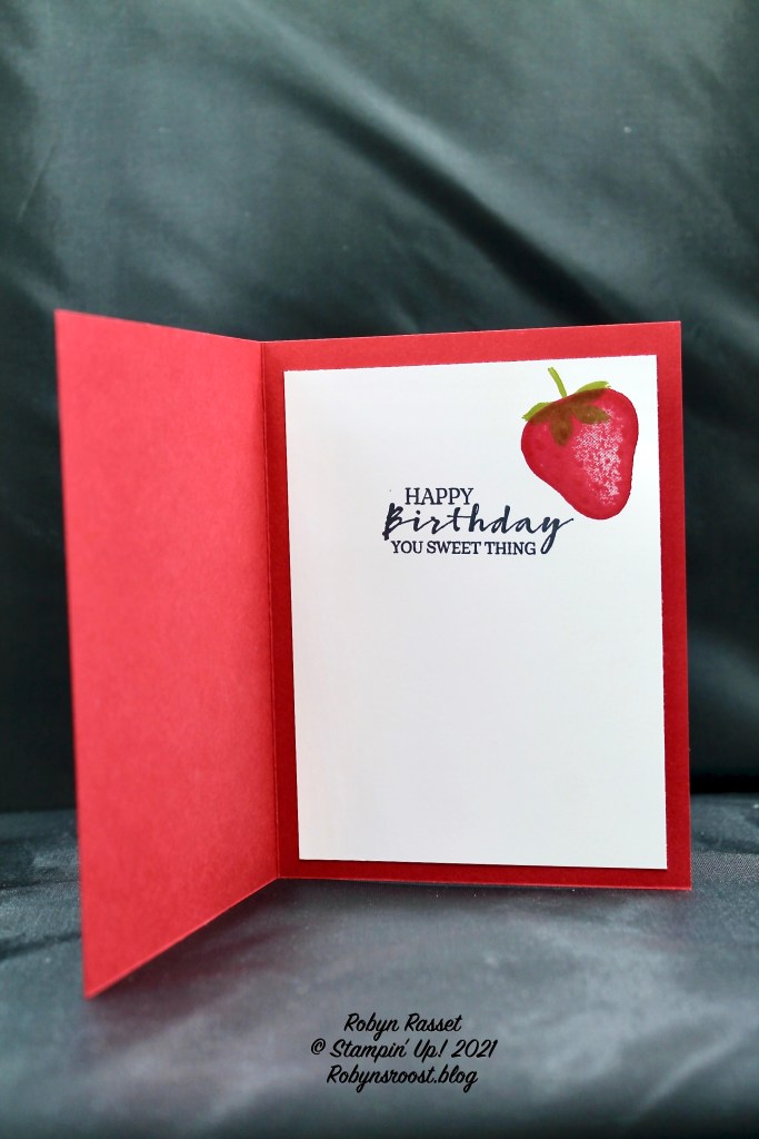 For the inside of the card a 3 3/4″ x 5″ Basic White layer was added. The greeting was stamped with Tuxedo Black ink and a strawberry was added. For the this strawberry I used just the fill in stamps without the outlines.