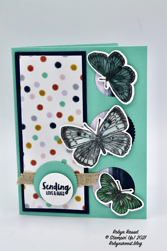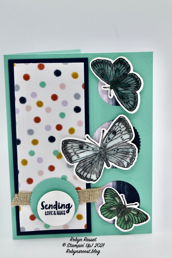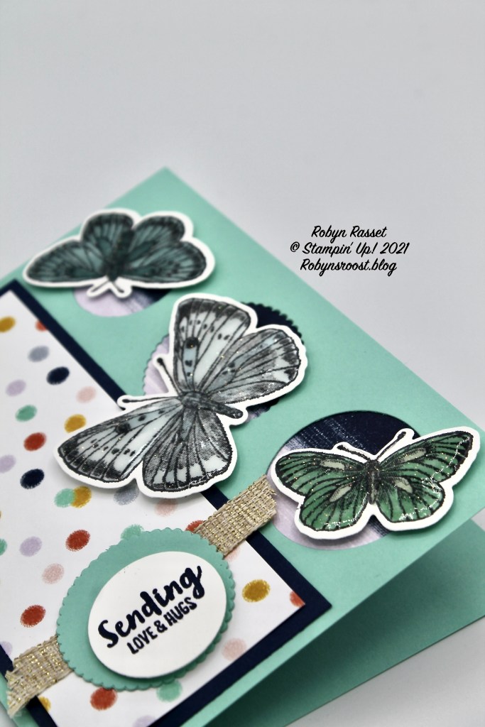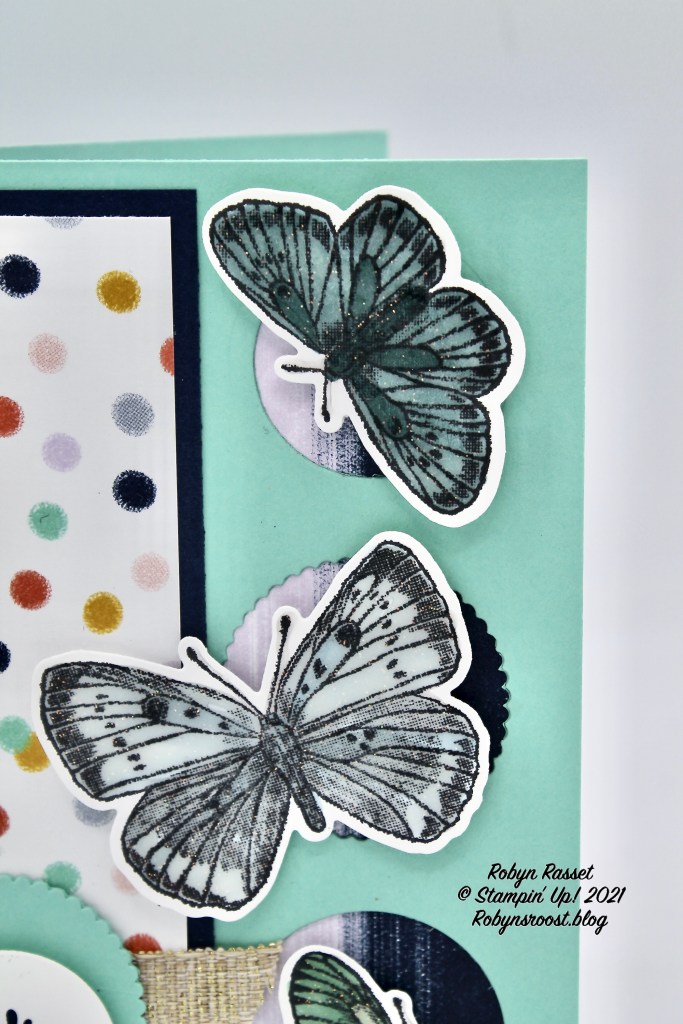 The butterflies were colored with Stampin’ Blends in various blues and greens and then Shimmery Crystal Effects were applied over the top. Tip: Have patience and leave them set until they are completely dry.