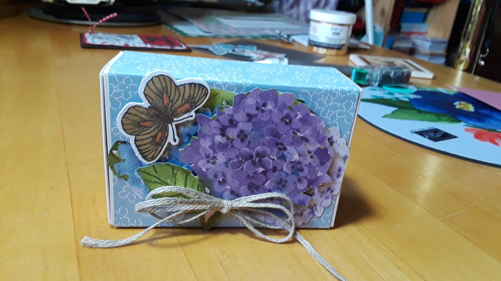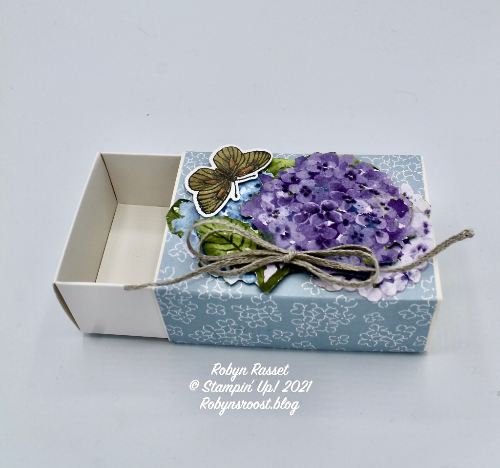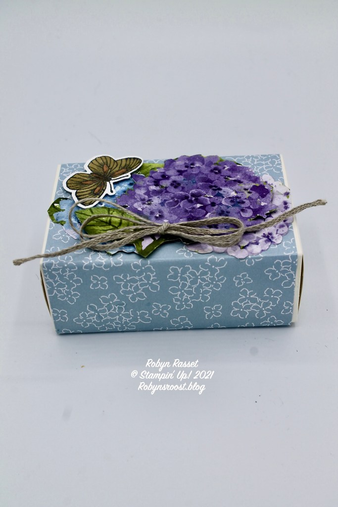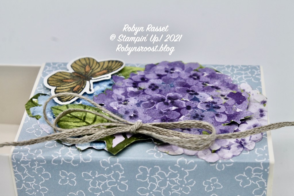 Because I don’t have the Hydrangea stamp set and dies, I fussy cut the flowers from the paper. I actually used two of the flowers from the edge of the paper (incomplete flowers) and glued them flat to the box with the bad sides meeting in the center and then layered the ‘good’ flower (compete image) over them popped up with a dimensional.