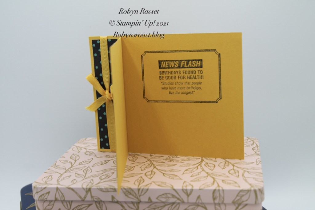 This humorous News Flash comes from the now retired Sale-a-bration set called Approaching Perfection. I think we all need to enjoy a bit more humor and this set is great for sending a smile. The label border stamp is in the Floating & Fluttering set and there is a matching die to cut it out in the Fluttering Dies.