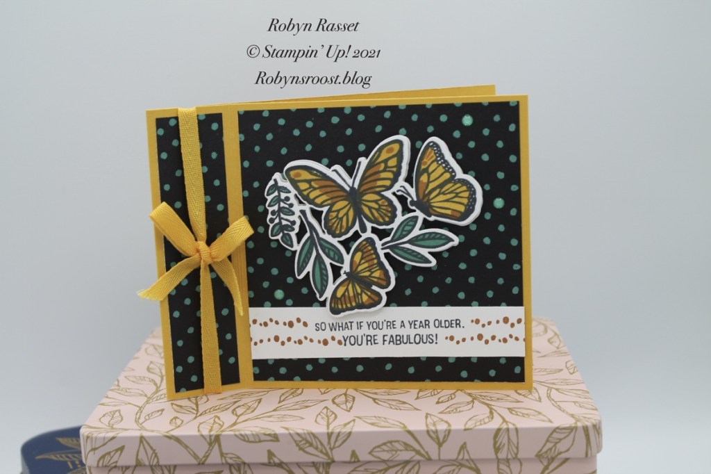 I found this completed but unposted blog entry in my drafts folder. I’m not sure why I never posted it but I thought you might like seeing the way that I doubled up the butterflies for a bit of a unique look. I’ve got a migraine headache leftover from yesterday and I’m not up to completing a new blog post. As I was feeding my horses this morning, I was thinking about how much easier it was to live in our 5th wheel camper for two months. Only an 8′ x 32′ house to clean instead of 30′ x 44′ house. I’ve always loved my house, we build it ourselves with some help from friends and family. When I say built it ourselves, I mean that we wheel borrowed the cement, pounded nails, stood the walls, hung the sheet rock, ran in plumbing, duct work and wires. My husband built the cabinets and wood work from wood that was cut on our property. It’s been a labor of love, but it’s starting to get to be too big and too much work for two old farts! Hopefully, it’s just my migraine hangover bugging me. Now on to some fun stamping!